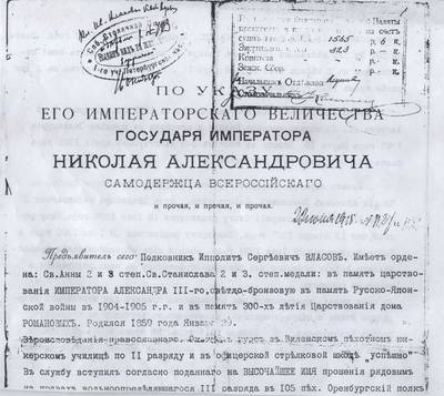 2. Указ от 04.01.1914 об отставке полковника Власова И.С., с перечнем наград, с послужным списком и составом семьи, г. Красноярск. (2 л., ксерокопия)