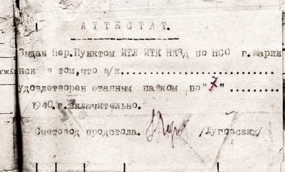 - Аттестат для пересылки з/к по этапу. г. Мариинск, 1940 (док. № 17).