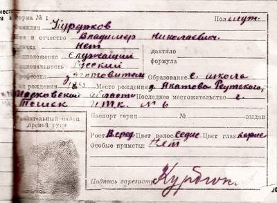 Я, оперуполномоченный оперативно-чекистского отдела УИТЛ и ИТК УНКВД по НСО — РАКИТА, рассмотрев поступившие из ИТК и ИТЛ УНКВД НСО материалы о преступной деятельности КУРДЮКОВА Владимира Николаевича, 1888 г. р., уроженца д. Акатово Реутского р-на, Московской области, русского, гр-на СССР, бывш. кулака, сужденного 5 декабря 1937 г. тройкой УНКВД по Московской области за к-р агитацию сроком на 10 лет, содержащегося в Томском ИТК № 6. КУРДЮКОВ В. Н. отбывает срок наказания в ИТК № 6 г. Томск.