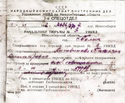 - Распоряжение о переводе заключенной Литвиновой содержанием под стражей за Особым Совещанием. Новосибирск, 14 июня 1942 г.