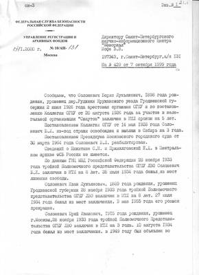 21. Письмо УРАФ ФСБ РФ №10/АН-131 от 19.01.2000 директору НИЦ "Мемориал" В.В.Иофе (ответ на запрос №429 от 07.10.1999) с архивными сведениями о Солоневиче Б.Л., Солоневиче И.Л. и Солоневиче Ю.Л., а также об отсутствии сведений о Никитине С.Н. и Пржиялговской Е.Д.