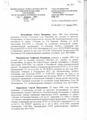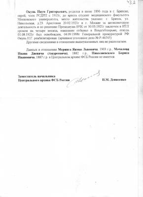 43. Письмо ЦА ФСБ РФ №10/АН-150 от 02.02.2000 директору НИЦ "Мемориал" В.В.Иофе (ответ на запрос №023 от 17.01.2000) с архивными сведениями о Мельниковой О.И., Микицинской Т.О., Наровчатове С.Н. и Окуне Н.Г., а также об отсутствии сведений о Меринге Я.Л., Мочалове И.Д.(А.) и Николаевском Б.И.
