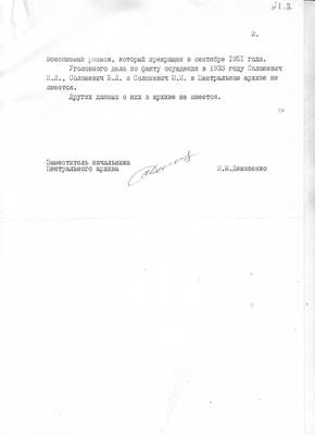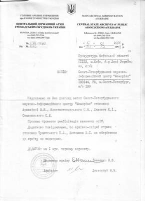 2. Письмо Центрального государственного архива общественных объединений Украины (Центральний державний архiв громадских об’єднань України) №784-789 от 05.01.2000 в НИЦ "Мемориал" (ответ на запрос №526 от 21.12.1999) с просьбой провести реабилитацию Аркавиной В.Я., Константиновского А.М., Ляховича К.И. и Семковского С.Ю., а также об отсутствии сведений о Тучапском П.Л. и Шейнмане З.С.
