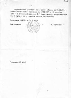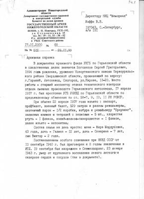 14. Письмо ГА Нижегородской области №68 от 17.01.2000 директору НИЦ "Мемориал" В.В.Иофе (ответ на запрос №512 от 29.11.1999) с архивными сведениями о Боголепове С.Г.