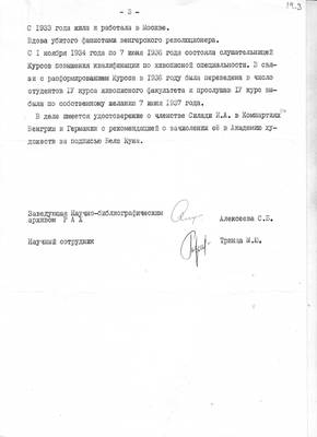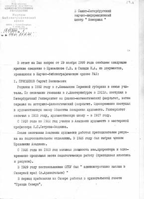 19. Письмо Научно-библиографического архива Российской Академии Художеств №1 от 18.01.2000 директору НИЦ "Мемориал" В.В.Иофе (ответ на запрос №516 от 29.11.1999) с архивными сведениями о Приселкове С.В. и Силади И.А.
