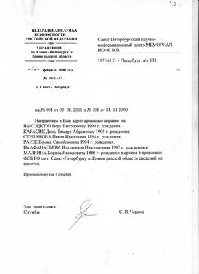 42-1. Письмо УФСБ РФ по СПб и ЛО №10/41-88 от 02.02.2000 директору НИЦ "Мемориал" В.В.Иофе (ответ на запрос №001 от 03.01.2000) с архивными справками на Высоцкую В.В., Карасик Д.-Т.А., Степанова П.И., Райзе Е.С., а также об отсутствии сведений об Афанасьеве В.Н. и Малкине Б.Я.