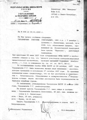 46. Письмо УФСБ по Республике Карелия №10/193/Н от 03.02.2000 директору НИЦ "Мемориал" В.В.Иофе (ответ на запрос №004 от 03.02.2000) с архивными сведениями о Герценштейне Г.Г.
