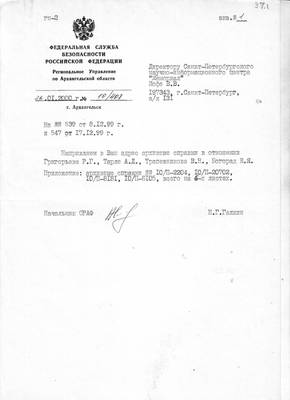 37-1. Письмо УФСБ РФ по Архангельской области №10/408 от 28.01.2000 директору НИЦ "Мемориал" В.В.Иофе (ответ на запросы №539 от 08.12.1999 и №547 от 17.12.1999) с архивными справками на Григорьева Р.Г., Тарле А.Д., Трапезникова В.Н. и Богорад Е.Я.