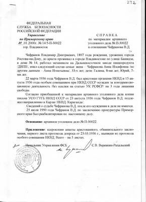 27-1. Письмо УФСБ по Приморскому краю №14/5-2195/318/з от 20.01.2000 в НИЦ «Мемориал» (ответ на запрос №378 от 09.09.1999) с архивными справками на Кулакова Н.Я., Кожанова М.Т., Подреза А.К., Чефранова В.Д. и ксерокопиями документов.