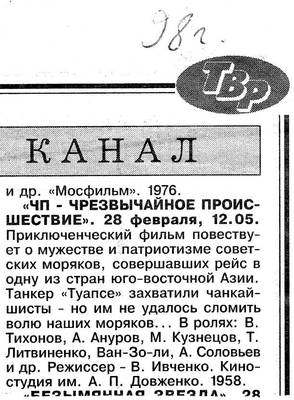 2. Вырезка из еженедельника «ТВ-Радио» от 28.02.1998г. с анонсом фильма «ЧП – чрезвычайное происшествие» о захвате советского танкера «Туапсе» чанкайшистами. (1л., газетная вырезка)