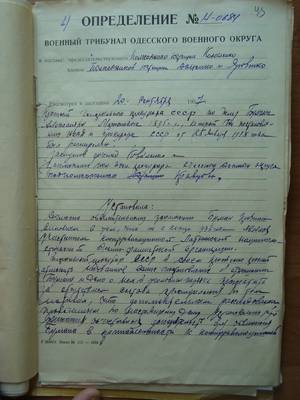 23. Determination No. N-0684 of the Military Tribune of the Odessa Military District No. 4n-013430/57 dated 09.20.1957 on the abolition of the resolution of the NKVD and the USSR Prosecutor of 01.25.1938 in relation to A.M. Buman. (2 sheets, electronic copy of typewritten copy).