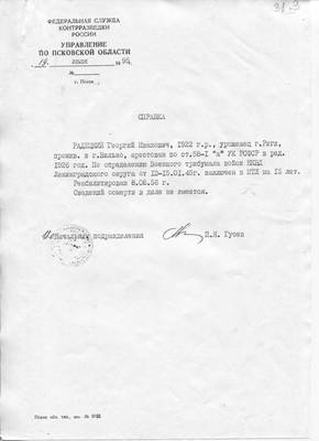 2. Letter No. 10/16-34 dated 02/09/1995 (answer to a request dated 01/19/1995) from the UFSK for St. Petersburg and Leningrad Region to V.V. Iofe, Chairman of the Memorial Research Center. about the available information on P.I. Neradovsky, P.I.
