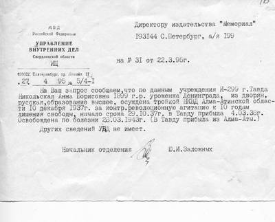 16. Letter from the Information Center of the Internal Affairs Directorate of the Sverdlovsk Region of the Ministry of Internal Affairs of the Russian Federation No. 5 / 4-1 OT 04.27.1995 (answer to request No. 31 dated 03.22.1995) to the director of the Memorial publishing house about the available information on Nikolskaya A.B.