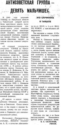 1. Article "Anti-Soviet group - nine boys", dedicated to A. Sennikov's group "Union of Revolutionary Fighters"; The year and title of publication are unknown. (1 sheet, photocopy).