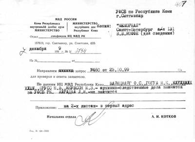 327. Letter of the Information Center of the Ministry of Internal Affairs of the Republic of Komi No. 3/2754 dated 07.12.1999 to the director of the Research Center "Memorial" V.V. and Yakubson I.S. appear for the FSB of the Republic of Komi, and the case of Karadzhi L.I. - does not appear.