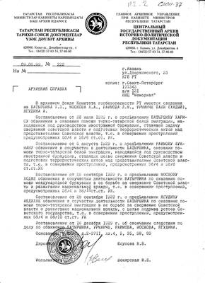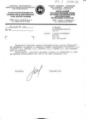 139. Letter of the KGB of the Republic of Tatarstan No. 8/2700 dated 07/23/1999 to the director of the Research Center "Memorial" V.V. and Hildebrandt N.I., as well as the lack of information about Malakhovskiy E.E.