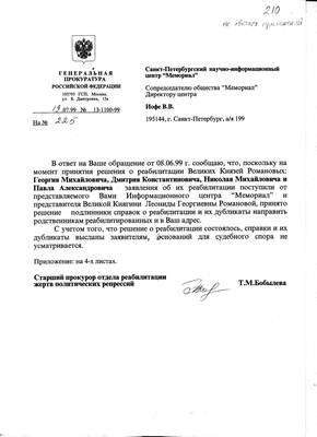 85_1. Letter from the General Prosecutor's Office of the Russian Federation No. 13/1100-99 dated 05/20/1999 to the director of the St. Petersburg Research Center "Memorial" Iof V.V. on the decision taken regarding the rehabilitation of the Grand Dukes of the Romanovs (so in the document) Georgy Mikhailovich, Dmitry Konstantinovich, Nikolai Mikhailovich and Pavel Alexandrovich.