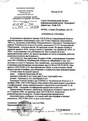 118-2. Determination of the VT of the Ural Military District No. 377 of 04/17/1956 on the rehabilitation of Pestov K.N.