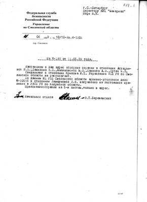 123-1. Letter of the Federal Security Service of the Russian Federation for St. Petersburg and Leningrad Region No. 10 / 57-504 dated 07/12/1999 to the director of the Memorial Research Center V.V. Agushevich Z.S. and Azhamitny A.S.