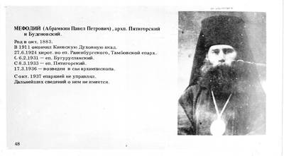 1. Photo and brief biographical information of Abramkin P.P. (Methodius, Archbishop of Pyatigorsk and Budenovsky) (1 sheet, photocopy).