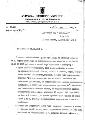 93. Letter from the USBU in the Odessa region. No. 10/221 dated 05.23.2001 to the director of the Memorial Research Center V.V. Iofe (response to request No. 238 dated 04.28.2001) with archival information about M.S. Khusid, L.G. Goffman, Z.D. Khaskin. , Rysse Z.A., Grinblate K.G., Goldmane A.I. and Fetisov G.F.