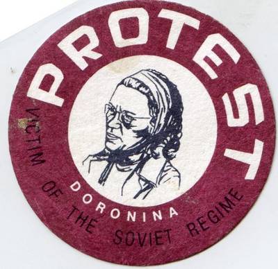 65. Sticker with the inscription “Protest. Doronina - victim of the soviet regime” with comments on the back. (1 sheet, original).