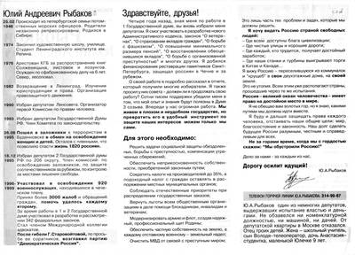 5. Election leaflet of Rybakov Yu.A. with a photocopy of the article “Human rights activists in the new parliament will have enough work” dated 07.12.1993. and “... the bull is not allowed” from the issue of “Evening Petersburg” dated 03/12/1994 on the back; (1 sheet, photocopy).