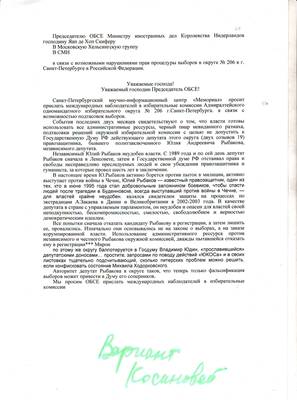 47. Request from the St. Petersburg Research Center “Memorial” to the OSCE with a request to send international observers to the election commissions of the Admiralty Izb. District No. 206 marked “Option Kosinova T.”
