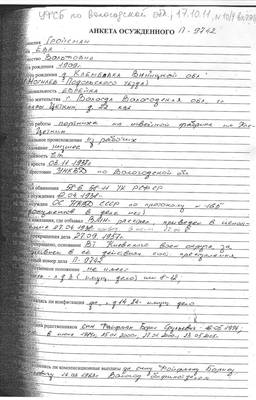 6. Appendix to the letter of the FSB in the Vologda region. dated October 17, 2011 No. 10/4 in. 2011 with the questionnaire of the convict Groysman E.V. No. P-9742 containing biographical information about her. (1 sheet, photocopy)