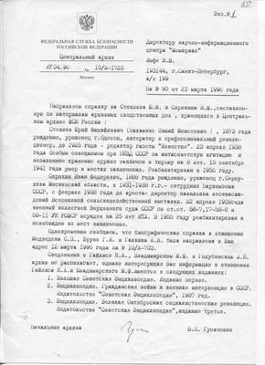 62. Certificate of the Central Election Commission of the FSB of the Russian Federation No. 10/A-1723 dated 04/18/1996 (response to request No. 90 dated 03/23/1996) to the director of the Memorial Research Center for Steklova Yu.M., Sorokina I.F., certificate for Bruno G.I. and Galkina A.V. was sent on April 12, 1996, with information regarding Gailis K.A., Vladimirsky M.F. and Golubovsky L.B. the archive does not have it.