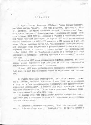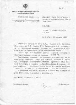 186. Letter from the Central Administration of the FSB of the Russian Federation No. 10 / A-5712 dated 11/30/1996 (reply to No. 255 dated 10/16/1996) to the director of the Memorial Research Center Iofe V.V. on the available information on V.K. Ikova, M.A. Brownstein-Valerianova, F.A.
