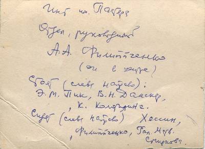 2. Group photo of employees of the laboratory of the parasitic typhus department of the Institute named after. Pasteur, headed by Filipchenko A.A. (in the center), standing (from left to right) - Peak E.M., Dansker V.N., [Kolfling? Coldring?] K., sitting Kheisin E.M., Filipchenko A.A., Smirnova G.M.; Leningrad, [1930s].