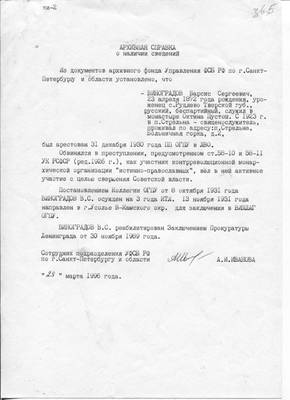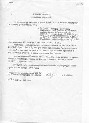 161. Cover letter of the Federal Security Service of the Russian Federation for St. Petersburg and the Leningrad Region No. 10 / 57-7467 n / s dated 10.31. 1996 Research Center "Memorial" Iofe V.V. (answer to No. 270 dated 10/23/1996) to the archival reference to Zemskov A.I.