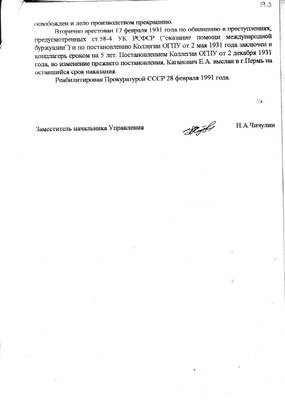 142. Letter of the Federal Security Service of the Russian Federation for the Sverdlovsk Region No. 16/1563 dated 07/23/1999 to the director of the Memorial Research Center V.V. and Ioffe O.L., as well as sending a request to Nazaryev-Pavlov M.F. and Yakubson L.S. to the State Archive of Administrative Bodies of the Sverdlovsk Region.