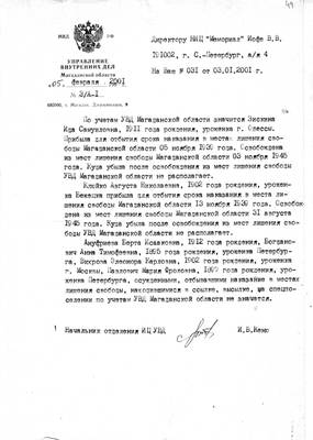 49. Letter from the Internal Affairs Directorate of the Magadan Region. No. 3 / A-1 dated 05.02.2001 to the director of the Memorial Research Center V.V. Iof (response to request No. 031 dated 03.01.2001) with archival information about I.S. and Klyuiko A.N., as well as the absence of information about Anufrieva B.I., Bogdanovich A.T., Vikhrova E.K. and Pavlovich M.F.