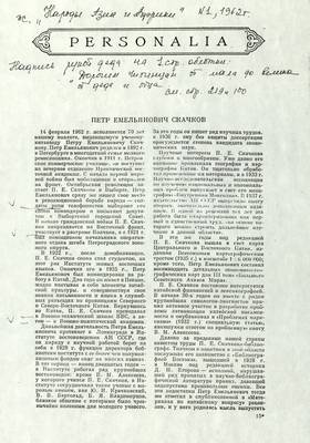 10. Article by Myasnikov V.S. “Peter Emelyanovich Skachkov”, published in the magazine “Peoples of Asia and Africa” No. 1, 1962, p. 219-221.