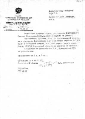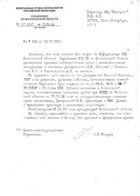 26.1. Letter from the ITs of the Internal Affairs Directorate of the Vologda Region. No. 2 / 13-13 dated 01.23.2001 to the director of the Memorial Research Center V.V. Iof (response to request No. 024 dated 01.03.2001) with an archival reference to N.I. Dneprovsky, as well as the absence of information about I.A. Balanovsky. and Komendantov N.V.