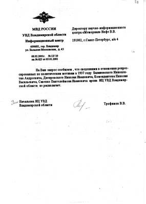 58. Letter from the Information Center of the Internal Affairs Directorate of the Vladimir region. No. 13/10 dated 02/08/2001 to the director of the Memorial Research Center V.V. Iofa (response to request No. 023 dated 01/03/2001) about the lack of information about I.A. Balanovsky, N.I. Dneprovsky, N.V. Komendantov. and Savenko P.N.