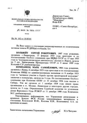 67. Letter from the Office of Registration and Archival Funds of the FSB of the Russian Federation No. 10/A-1669 dated 04.23.2001 to the director of the Memorial Research Center V.V. Iofe (response to request No. 182 dated 03.18.2001) with archival information about S.R. Kollweit, Kompaneets M.S., as well as the lack of information about Kononova Yu.N., Koptev K.N. and Kopyatkevich A.A.