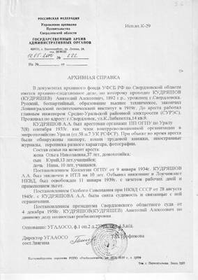 Genus. in Yekaterinburg in 1892; Russian; b/p; higher technical education - graduated from the Petrograd Polytechnic Institute in 1919. In 1933 he lived in Sverdlovsk, worked as the chief engineer of the Sredneuralsk regional electrical network. Arrested by the OGPU PP in the Urals on September 7/8, 1933; sentenced by the Kogpu on January 09, 1934 to 10 years in labor camp; served his sentence in 1934-1937 on the construction of the Moscow-Volga canal, from 1937 - in the Lokchimlag of the NKVD (Komi Autonomous Soviet Socialist Republic); released on January 11, 1939 with credit for working days and application of benefits. By the resolution of the OSO under the NKVD of the USSR on August 28, 1945, the criminal record and the restrictions associated with it were lifted. After his release he lived in Pervouralsk. Rehabilitated by the Presidium of the Sverdlovsk Regional Court on December 4, 1958. He died in Pervouralsk in 1948.