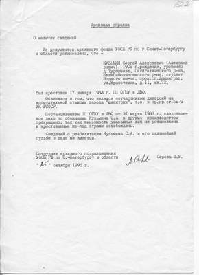 152. Covering letter of the Federal Security Service of the Russian Federation for St. Petersburg and the Leningrad Region No. 10 / 40-7597s dated 10/25/1996 (answer to No. 292 dated 10/14/1996) to archival references to N.V. Petrovskaya, S.A. Kuzmina. and about the lack of information on Vilkitsky B.A., Vtorova M.A., Gukovsky A.I., Dalsky M.V., Sapozhnikov A.A.