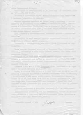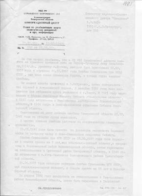 150-2. Archival certificate of the Internal Affairs Directorate of the Novosibirsk Region. No. 10/11-665 dated 10/22/1996 (answer to No. 257 dated 09/28/1996) Research Center "Memorial" on Lekarenko N.A.