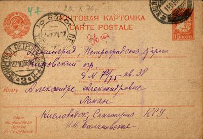 14. Letter (on a postcard) from Leman-Balanovskaya I.N. dated 18.10.1936 to the wife of her brother Leman A.A. from Kislovodsk about her vacation at the sanatorium, (p/w 18.10.1936/23.10.1936).