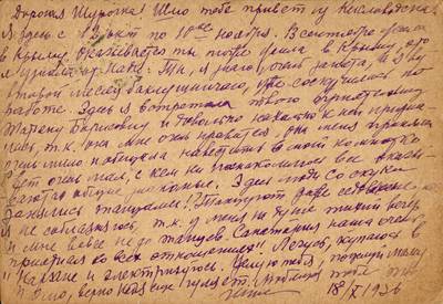 13. Letter (on a postcard) from Leman-Balanovskaya I.N. dated 05/07/1936 to the wife of her brother Leman A.A. with birthday greetings and about two excursions conducted at the Pulkovo Observatory, (p/w 05/08/1936/05/09/1936).