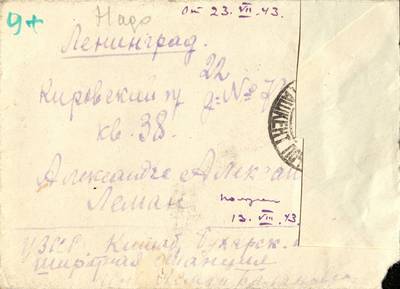 25. Envelope of a letter from Leman-Balanovskaya I.N. dated 04.05.1943 from the city of Pskent, Tashkent region, Uzbekistan to the wife of Leman's brother A.A. in Leningrad with the stamp "Reviewed by military censors"; p/sh irr/01.06.1943.