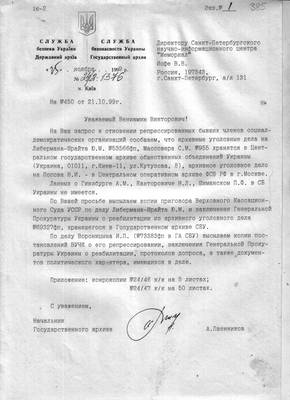 305. SBU letter No. 24/2-1376 dated 11/25/1999 to the director of the Research Center "Memorial" V.V. and Popova N.I., about the lack of information about Ginzburg A.M., Kantorovich N.L. and Shimansky P.F., as well as with copies of the verdict in the case of Lieberman-Shrait Yu.M. and documents in the case of Voronitsyna AND.P.