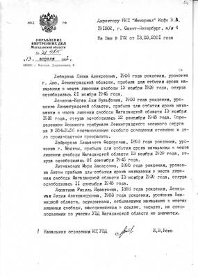 54. Letter from the Internal Affairs Directorate of the Magadan Region. No. 3/485 dated 04/13/2001 to the director of the Memorial Research Center V.V. Iofa (response to request No. 172 dated 03/13/2001) with archival information about E.A. Lebedeva, L.V. Levieva-Kogan, E. Leizerova. F., Litmanovich M.Z., as well as the lack of information about Lopatina R.I. and Levitskaya L.A.