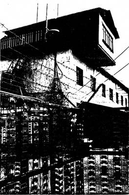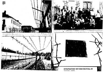 21. Photo of a group of former political prisoners against the backdrop of a Perm camp barracks, photographs of buildings and fences with barbed wire, July 1992.