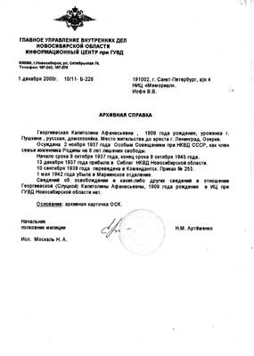 1.9. Archival information of the Information Center of the Main Internal Affairs Directorate of the Novosibirsk Region. No. 10/11-B-226 dated 12/01/2000 to Georgievskaya K.A.