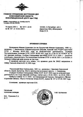 11. Letter from the Information Center at the Central Internal Affairs Directorate of the Novosibirsk Region. No. 10/11-B-53 dated March 19, 2001 to the director of the Memorial Research Center V.V. Iofa (response to request No. 107 dated February 10, 2001) with archival information about M.A. Valerianov. and Rashkovsky I.G.